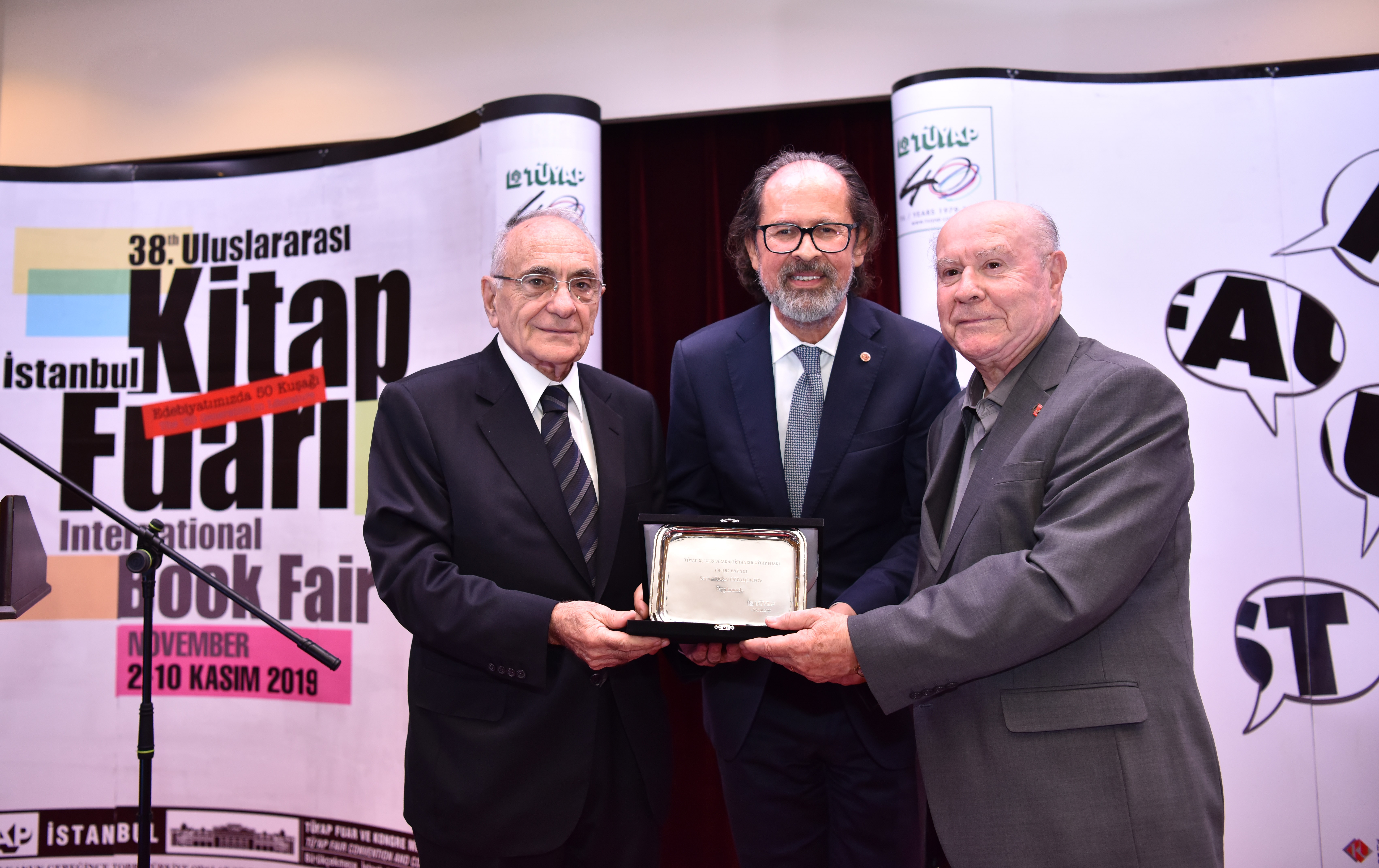 Otuz sekizinci yaşını “Edebiyatımızda 50 Kuşağı” teması ile selamlayan Uluslararası İstanbul Kitap Fuarı Onur Yazarı Ödülü Adnan Özyalçıner’e TÜYAP Yönetim Kurulu Başkanı Bülent Ünal tarafından verildi.