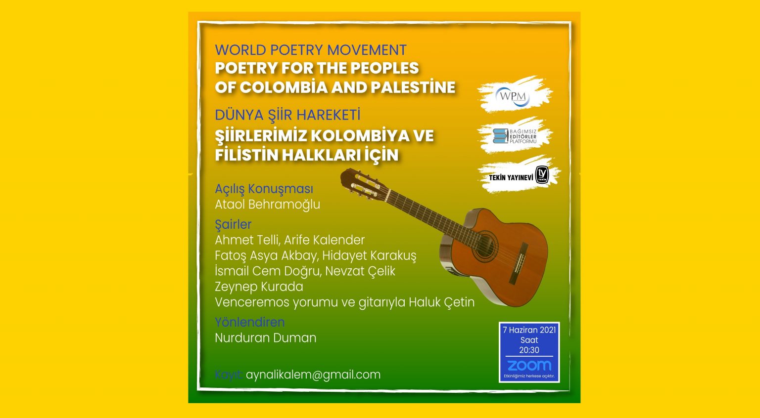 Dünya Şiir Hareketi (World Poetry Movement) etkinlikleri kapsamında, “Dünya Şiir Hareketi Türkiye” Haziran ayında “ŞİİRLERİMİZ KOLOMBİYA VE FİLİSTİN HALKLARI İÇİN” adıyla şiir etkinliği düzenliyor. Açılış konuşmasını Dünya Şiir Hareketi kurucularından Ataol Behramoğlu’nun yapacağı, Nurduran Duman’ın yönlendirdiği etkinlikte Ahmet Telli, Arife Kalender, Fatoş Asya Akbay, Hidayet Karakuş, İsmail Cem Doğru, Nevzat Çelik, Zeynep Kurada şiirleriyle yer alırken, Haluk Çetin de Venceremos yorumu ve gitarıyla konuk olacak. Bağımsız Editörler Platformu ve Tekin Yayınevi’nin destek verdiği etkinlik 7 Haziran 2021, Saat 20:30’da zoom üzerinden yapılacak. Herkese açık.
